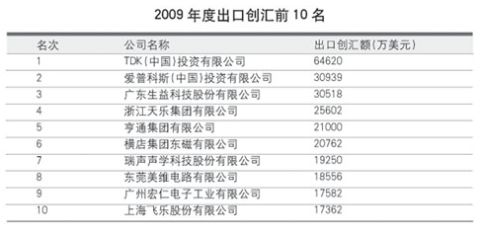 對于中國電子元件行業(yè)的外貿(mào)出口來說,2009年是一個從谷底緩慢爬升的過程。本屆元件百強中出口創(chuàng)匯總額為52.48億美元,同比下降10.38%,占銷售收入總額的28.81%,與上屆元件百強的出口總額相比,下降了9.83%。由于國際金融危機導致了外需萎縮,而且我國刺激內(nèi)需的各項政策效果明顯,一些元件百強企業(yè)開始更多地關(guān)注國內(nèi)市場,所以本屆元件百強的出口創(chuàng)匯額雖然下滑,但整體銷售收入仍然獲得增長。