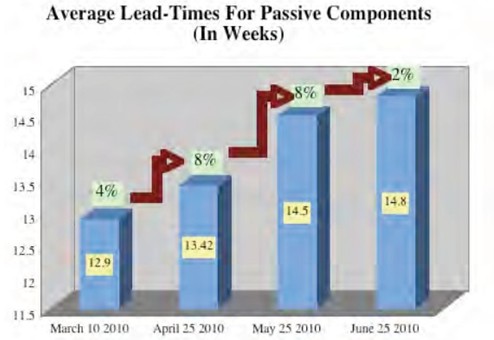 根據(jù)Paumanok Publications, Inc公司調(diào)查顯示,上月被動元件交貨期平均每45天就延長4%(被動元件交貨期繼續(xù)延長 供應(yīng)鏈持續(xù)緊張),最近一次調(diào)查則顯示,截止6月25日被動元件交貨期和上月相比再次提升2%,平均交貨期為14.8周。下圖為3月至6月25日的被動元件交貨期情況。