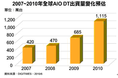 平價一體式桌上型計算機(All In One PC;AIO PC)在2009年創(chuàng)下685萬臺,成長45.7%后,DIGITIMES Research預估2010年將進一步提高至1,115萬臺,成長62.8%,展現(xiàn)新興產品的強勁成長力道。