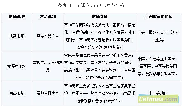 醫(yī)療設備的發(fā)展與國家和地區(qū)的經(jīng)濟發(fā)展水平、醫(yī)療政策以及當?shù)鼐用袷杖胨较⑾⑾嚓P(guān),這些因素導致全球醫(yī)療監(jiān)護儀市場發(fā)展不平。根據(jù)市場特征以及對產(chǎn)品需求的不同可以將醫(yī)療監(jiān)護儀市場分為成熟市場、發(fā)展中市場和初級市場。