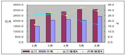 五、內(nèi)外銷(xiāo)保持同步增長(zhǎng),出口繼續(xù)快于內(nèi)銷(xiāo)。今年以來(lái),隨著外需不斷回暖,外銷(xiāo)出現(xiàn)持續(xù)增長(zhǎng),到5月底,全行業(yè)累計(jì)外銷(xiāo)增速開(kāi)始超過(guò)內(nèi)銷(xiāo),進(jìn)入6月份,外銷(xiāo)增速優(yōu)勢(shì)進(jìn)一步加強(qiáng),超過(guò)內(nèi)銷(xiāo)增速4個(gè)百分點(diǎn)。其中,內(nèi)銷(xiāo)產(chǎn)值11975.5億元,同比增長(zhǎng)27.2%;出口交貨值16647.1億元,同比增長(zhǎng)31.2%,高于產(chǎn)業(yè)平均增速1.7個(gè)百分點(diǎn)。產(chǎn)業(yè)出口依存度(58.1%)比去年同期提高0.7個(gè)百分點(diǎn),比前5個(gè)月下降0.6個(gè)百分點(diǎn)。