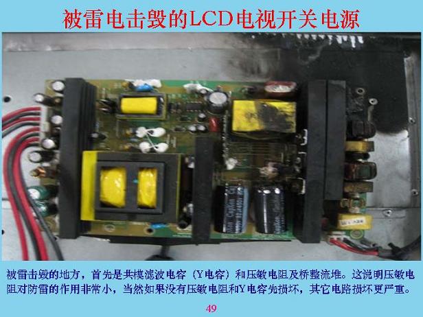 下面我們講一些具體的。這是一個開關電源,開關電源被雷劈的時候,輸入回路基本上都燒了,假如沒燒是什么樣的?可以看看,這是橋堆,這兩個是Y電容,這里面還有一個壓敏電阻。這是共模線圈,雷劈以后全部燒了,說明壓敏電阻沒有起到什么保護作用,兩個電容都燒了,說明電感相當、相當?shù)馗?。為了防止雷電,首先前面一定要加一個能量吸收,比較大的東西,成本相對來說比較低,像試驗站里面的放電裝置,那個東西沒有地方裝,也貴得很。在硬紙板上面排幾個鋸齒,中間隔一個頭就行了。如果中間隔6mm也可以。有一個一級電感,電感可以使瞬間上去很快的電壓降下來,突然加一個1萬伏、10萬伏,加上去只有這兩端,另外兩端建立不起來,所以剛加進去的時候對雷電來說,大部分能量都被吸收掉了。后面經(jīng)過這個以后,剩余部分通過共膜電容繼續(xù)吸收,吸收完以后還有差模部分,產(chǎn)生的差模部分通過電容把差模吸收掉。共模電容和差模電容具有抑制傳導干擾的作用,對雷電也有抑制作用,所以很多人也在問,電容接到前面好還是接在后面好?這個東西看你有什么作用,如果只是為了防EMI電磁干擾的話,接在越前面越好,接在測試儀表的輸入端最好,接到那里把信號全部短路掉了,就看不到了。但是對于雷電,你接到后面要好很多,所以這主要是防雷的,你就不要考慮電磁干擾和EMC了,盡量把兩個放在后面。