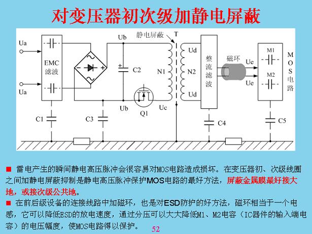 對于一些比較貴重的儀器、設備,在開關電容電壓器這里最好做靜電比例,在初次級線圈中間做一個鋁箔片都可以,包一層,這層不能短路,短路的話變壓器就會燒掉,包在外面可以短路,包在里面不能短路,包在外面吸收漏電電感,包在里面的主回路里面會短路,然后把它進行接地,這相當于可以隔離掉。這個有一個教訓,前段時間康佳臺灣裝LCD屏測試,打了一個隔離變壓器,后面就是接測試儀表,每個月都有一臺、兩臺測試儀表損壞,查不出原因,最后讓他們把隔離變壓器的中間屏蔽才好。屏蔽以后,進一步有機會的話,在接頭有連接的地方加一個磁環(huán),讓共模電壓將磁環(huán)速度放慢,緩沖一下,讓瞬間能量降低,瞬間能量緩慢一點,慢慢的過,損傷就會少很多。所有電路都可以把它看成一個分布電流,只要某地方電壓電位在改變,對后面都會產(chǎn)生充放電,從這上面理解就知道了,如果哪個地方構成回路,如果有一個高電壓進來一直傳導到后面,最后充電,充電可以理解成分布電容,如果沒有這個也有一個分布電容在里面,把分布電容放在這里,就比較形象地。就像以前的絕緣長效濾管一樣,手一摸沒有造成回路也壞掉了,絕緣的濾管很容易壞,一從里面拿出來,手一摸就壞掉,一個身上面帶正電,或者你作為天線有感應電壓,感應一下來回充放電就壞掉了。