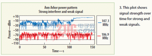 圖1顯示了這次在地圖上的測試行駛,其中3kW的發(fā)射機架在高大建筑物的樓頂。雖然天線在直接視線范圍內(nèi),但干擾源處于峰值水平,接收到的106.7MHz目標頻率信號質(zhì)量下降嚴重。圖2顯示了信號強度的典型頻譜,圖3顯示了測試行駛期間2個信號的強度。