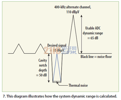 為方便案例分析,假設目標微弱信號的功率是30dBμV,強干擾源的功率是110dBμV,頻率與目標信號相距400kHz。這將是一個應用于FM收音機的最嚴格測試,也是在測試行駛的最差部分中遇到的典型情景(圖7)。在這些實驗條件設定好后,就可以計算系統(tǒng)的有效動態(tài)范圍。在現(xiàn)場ADC記錄動態(tài)范圍約65dB、FM腔體陷波濾波器約50db抑制能力下,這個測試系統(tǒng)在感興趣頻率點的動態(tài)范圍約為115dB。