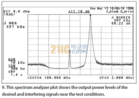 在不同的發(fā)生器1頻率設置點觀察到以下現(xiàn)象:如果測試裝置有限制因素,那么音頻的信噪比(SNR)不會隨著干擾射頻信號的遠離而變化。如表所示,接收機的去靈敏作用是由強大的干擾源引起的,從而證明來自測試裝置的噪聲不是106.7MHz測試頻率點的限制因素。
