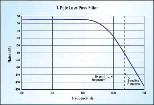 我們最好采用125倍的增益,以便多留一點(diǎn)余量。以40kHz這個(gè)最高信號(hào)頻率為例,取樣率便成為一個(gè)令人擔(dān)憂的問(wèn)題。為免高于尼奎斯特頻率的混疊信號(hào)頻率,我們必須將取樣頻率的一半加以濾波,然后將振幅抑制至模擬/數(shù)字轉(zhuǎn)換器的1LSB以下。在這個(gè)例子中,我們所采用的是12位的模擬/數(shù)字轉(zhuǎn)換器,其參考電壓為4.096V,將得到1mV解析度,計(jì)算方法如下: