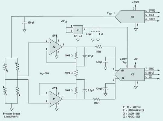 上例電路的液壓傳感器屬于電阻性電橋,傳感器的輸出取決于電阻值的變動(dòng)及驅(qū)動(dòng)電阻的電壓,并與兩者有函數(shù)上的關(guān)系。圖3所示的傳感器具有0.2mV/V的敏感度。DAC081S101是一款8位的數(shù)字/模擬轉(zhuǎn)換器,可以改變驅(qū)動(dòng)電橋的電壓,以便為液壓測(cè)量電路提供增益控制。例如,數(shù)字/模擬轉(zhuǎn)換器輸出若設(shè)定為4V,那么全標(biāo)度液壓便可達(dá)25.6PSI。若輸出電壓為1V,全標(biāo)度液壓便高達(dá)102PSI。