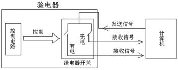 前文中信號是通過驗電器裝置發(fā)送到計算機,此時就遇到一個共地線問題,要讓計算機正確地識別驗電器傳送過來的信號就必須使計算機和驗電器共一個地線,否則,會因傳送線路過長不共地線而導(dǎo)致計算機識別信號出錯。本文改變信號傳送方式,如圖2所示,由計算機發(fā)送信號,驗電器內(nèi)部通過繼電器開關(guān)來控制有電或無電線路的導(dǎo)通或斷開,計算機接收由自己發(fā)送的經(jīng)過繼電器開關(guān)送來的兩路信號,若有電線路送來高電平信號,則無電線路送來低電平,此時高壓線有電;若無電線路送來高電平信號,則有電線路送來低電平,高壓線無電,若兩路線路都送來高電平信號或低電平信號則電路出錯。