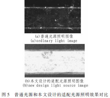 從圖5可以看出,使用普通光源僅僅能將上線寬附近的法線方向接近水平45°的線路照亮,如圖5(a)中兩根橫向亮線。由于厚密線路對(duì)光線的強(qiáng)烈遮擋作用,基材部分亮度非常低且接近下線寬亮度,肉跟幾乎不可分辨其差別。而由于線路表面的反射接近鏡面反射,導(dǎo)致到達(dá)線路表面的光線不能進(jìn)入鏡頭的收光光錐,上線寬以內(nèi)亮度也非常低。圖像沒有將PCB線路信息有效記錄,分析下線寬的精度很低且上線寬有固定系統(tǒng)誤差。而使用本文設(shè)計(jì)的適配光源的圖像,均勻度和清晰度良好。由于光源角度經(jīng)過仔細(xì)考慮,使得基材/線路過渡/線路表面的亮度呈現(xiàn)出階梯式上升且不同特征之間過渡區(qū)域小,有利于提高測試精度,實(shí)現(xiàn)對(duì)所關(guān)注線路的照明及信息提取。對(duì)于圖像處理來說是非常理想的源圖像。