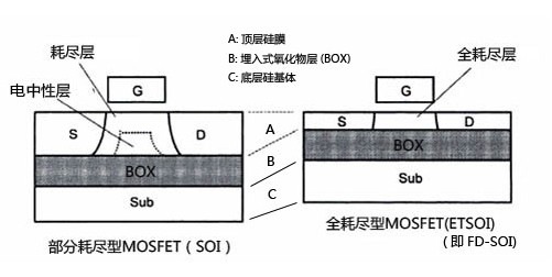 體硅CMOS技術(shù)走到22nm之后,特征尺寸已很難繼續(xù)微縮,急需革新技術(shù)來維持進(jìn)一步發(fā)展。在候選技術(shù)之中,F(xiàn)DSOI(Fully Depleted SOI,全耗盡SOI)技術(shù)極具競(jìng)爭(zhēng)力。對(duì)于FDSOI晶體管,硅薄膜自然地限定了源漏結(jié)深,同時(shí)也限定了源漏結(jié)耗盡區(qū),從而可改善DIBL(Drain Induced Barrier Lowering,漏致勢(shì)壘降低)等短溝道效應(yīng),改善器件的亞閾特性,降低電路的靜態(tài)功耗。此外,F(xiàn)DSOI晶體管無需溝道摻雜,可以避免RDF(Random Dopants FluctuatiON,隨機(jī)摻雜漲落)等效應(yīng),從而保持穩(wěn)定的閾值電壓,同時(shí)還可以避免因摻雜而引起的遷移率退化。
