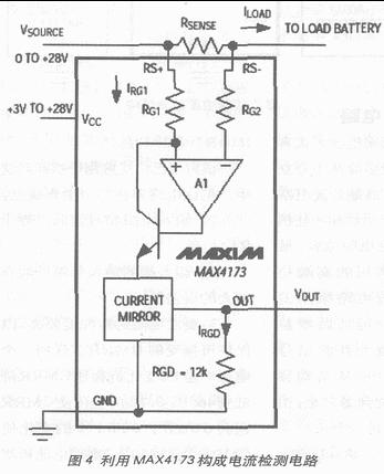 MAXIM推出了一系列雙向或單向電流檢測IC,有些雙向電流檢測IC內(nèi)置檢流電阻,可檢測流入或流出被檢電路的電流大小并通過一個(gè)極性指示引腳顯示電流方向。增益可調(diào)的電流檢測IC、固定增益(+20V/V,+50V/V,或+100V/V)電流檢測芯片或包括單雙比較器的固定增益電流檢測IC,都采用小體積封裝,如SOT23,可滿足對尺寸要求苛刻的應(yīng)用。圖4是用MAX4173構(gòu)成的高端電流檢測電路。[page]