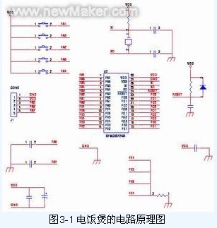 1、由單片機(jī)SPMC65P2404A控制的電飯煲的硬件原理圖如圖3-1所示,它包括按鍵輸進(jìn)部分,溫度檢測(cè)輸進(jìn)電路,復(fù)位和晶振電路,PA6、PA7完成對(duì)頂蓋和底盤(pán)的溫度的檢測(cè),PA5完成對(duì)繼電器的控制,SPMC65P2404A是系統(tǒng)的核心部分。