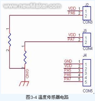 J2和J3是溫度傳感器的兩個(gè)接口,其中J2和J3分別是頂蓋和底盤(pán)溫度傳感器的接口,單片機(jī)檢測(cè)的信號(hào)實(shí)際上是與溫度傳感器分壓的電阻的電壓值,由于溫度傳感器的電阻值會(huì)隨溫度的上升而減小,所以分壓電阻的電壓值間接反映了某一時(shí)刻的溫度,電路原理圖如圖3-4所示: