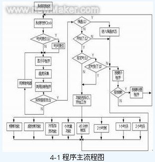 從樣機(jī)分析中大致設(shè)計(jì)整個(gè)系統(tǒng),整個(gè)系統(tǒng)輸進(jìn)包括2個(gè)溫度傳感器,5個(gè)按鍵;輸出包括2位七段數(shù)碼管、10個(gè)發(fā)光二極管、繼電器控制信號(hào)等。根據(jù)控制功能,將程序設(shè)計(jì)為幾個(gè)主要的模塊,程序主流程見(jiàn)圖4-1所示: