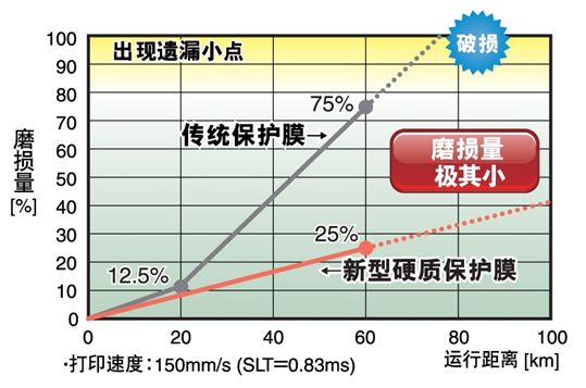 為了應(yīng)對(duì)這種情況,采取了將打印頭的保護(hù)膜材料變更為硬質(zhì)材料等對(duì)策,但提高保護(hù)膜的強(qiáng)度的課題是保護(hù)膜的組成和發(fā)熱部分的形狀設(shè)計(jì)。在以往的產(chǎn)品中,使用某些劣質(zhì)熱敏紙時(shí),使用壽命僅10km左右,這當(dāng)然與打印機(jī)的使用頻率也有關(guān)系,但發(fā)生過(guò)幾個(gè)月左右就無(wú)法使用的案例。羅姆面對(duì)這種情況,一直致力于改善保護(hù)膜材料中的硬質(zhì)材料的結(jié)構(gòu)和打印頭結(jié)構(gòu)。這次開(kāi)發(fā)的熱敏打印頭通過(guò)優(yōu)化保護(hù)膜材料的構(gòu)成物質(zhì)及其組成,大幅提高了耐磨性,實(shí)現(xiàn)了比以往產(chǎn)品高約3倍的耐久性(保證150km(以往產(chǎn)品是50km))。另外,通過(guò)提高保護(hù)膜的熱導(dǎo)率,打印效率也比以往改善了15%,同時(shí)還提高了打印質(zhì)量。而且,這種打印頭的形狀保持與以往產(chǎn)品完全相同,因此無(wú)需進(jìn)行打印機(jī)的設(shè)計(jì)變更,另外,這種規(guī)格還可以用于修補(bǔ)替換。