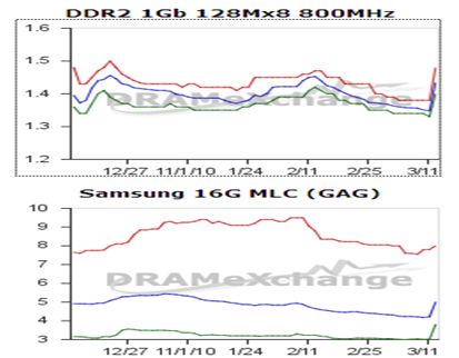 從DDR3來看,市場已經(jīng)聞風(fēng)而動,顆粒價格有明顯上升的勢頭,尤其是金士頓內(nèi)存(見下表),未來一段時間內(nèi)價格有可能繼續(xù)上揚(yáng)。一些經(jīng)銷商預(yù)計閃存價格地震后將出現(xiàn)15%以上的漲幅,已經(jīng)開始小幅提價,并出現(xiàn)了惜售的心態(tài)。目前甚至不排除部分經(jīng)銷商囤貨了。