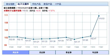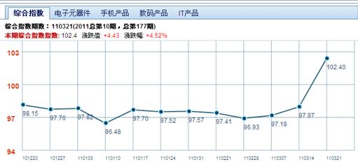 需要特別指出的是,四大成分指數(shù)之一的電子元器件指數(shù)的漲幅最為明顯,本期指數(shù)從3月14日的102.47點(diǎn),漲到了110.53點(diǎn),漲幅為7.87%,也是3年來之最??磥恚毡镜卣饘θA強(qiáng)北指數(shù)的影響也是達(dá)到了峰值,也充分說明,華強(qiáng)北電子元器件市場已經(jīng)受到了日本地震的強(qiáng)烈沖擊。