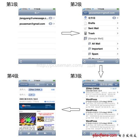 ②對確認(rèn)的功能結(jié)構(gòu)考慮在iPhone上的信息架構(gòu)模型。上文說過,iPhone應(yīng)用是線性的連貫操作,一層一層進(jìn)入直到完成最后的任務(wù),所以你要按這個(gè)思路去整理信息架構(gòu),一般來說,操作的深度不要超過3層,如果超過3層就要對產(chǎn)品形態(tài)進(jìn)行扁平化處理,即由深度改為廣度,因?yàn)殡S著深度的增加,每一級別都會(huì)有不同的功能,甚至有承載上一級的功能或邏輯,深度越多,這些功能就會(huì)越復(fù)雜,而在手機(jī)如此小的空間上就很難進(jìn)行合理組織。