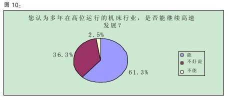 據(jù)年初中國機(jī)床工具工業(yè)協(xié)會(huì)的預(yù)測,2011年機(jī)床行業(yè)總體增幅將大于10%。從本次調(diào)查的情況來看,業(yè)界對行業(yè)的增長預(yù)期要比協(xié)會(huì)方面直接和樂觀許多,有61.3%的受訪者認(rèn)為,多年來高位運(yùn)行的機(jī)床行業(yè)“能繼續(xù)高速發(fā)展”,而持“不能”態(tài)度的人僅占2.5%(詳見圖10)。