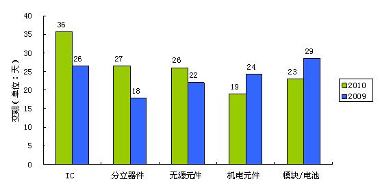 本次調(diào)查的結(jié)果印證了2010年電子行業(yè)所面臨的“缺貨”困境——2010年電子系統(tǒng)制造商與設(shè)計公司面臨的最普遍的采購風險是無法供貨,43.6%的公司面臨著供應(yīng)商無法供貨的困擾。與2009年的調(diào)查做對比,2010年IC、分立器件、無源元件、機電元件、模塊/電池五大類物料價格有不同幅度增長,其中IC與分立器件漲幅最大,機電元件、模塊/電池漲幅最小;交貨期方面,IC、分立器件、無源元件交貨期都有所延長,而機電元件、模塊/電池交貨期分別縮短了5天和6天;貨款結(jié)算期方面,IC、分立器件貨款結(jié)算期均有所延長,無源元件、機電元件、模塊/電池的貨款結(jié)算期都縮短了。
