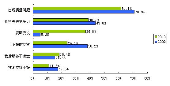 在缺貨的大環(huán)境下,不少電子系統(tǒng)制造商被迫更換供應(yīng)商。導(dǎo)致合格供應(yīng)商降級的最主要因素依次是物料出現(xiàn)質(zhì)量問題、價格失去競爭力和貨期變長。物料質(zhì)量問題在任何情況下都是不可妥協(xié)的;價格失去競爭力也就是價格上漲壓縮了下游公司的利潤空間;而貨期變長導(dǎo)致供應(yīng)商降級的比例變化最顯著,由2009年的5.2%大幅上升至2010年的36.8%——這是供應(yīng)鏈調(diào)整的表現(xiàn)。因此,系統(tǒng)廠商在考察新供應(yīng)商時,除了考察物料質(zhì)量因素外,產(chǎn)品性價比和供貨能力也是重要的考慮因素。