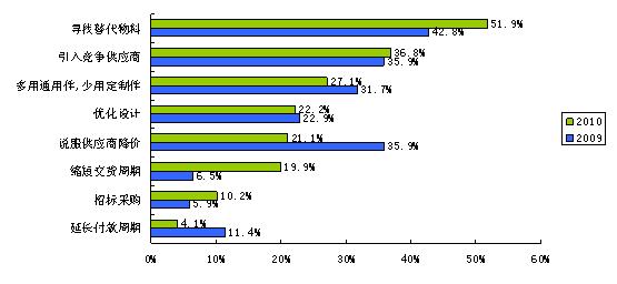 在缺貨漲價的氣氛中談COSTDOWN注定是個艱難的過程。調(diào)查中顯示,2010年最主要的COSTDOWN方式是尋找替代物料和引入競爭供應(yīng)商。與2009年相比,尋找替代物料依然是最重要的COSTDOWN方式,但采取說服供應(yīng)商降價這種方式的人少了許多,由35.9%降至21.1%,其中,2億營業(yè)額以上的大公司在砍價方面顯然更有話語權(quán)。