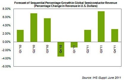 根據(jù)IHS的統(tǒng)計(jì),日本共有14家半導(dǎo)體供應(yīng)商與4家硅晶圓制造商受到地震沖擊。該機(jī)構(gòu)預(yù)期,全球半導(dǎo)體營(yíng)收將在第三季獲得加強(qiáng)力道,當(dāng)季成長(zhǎng)率可達(dá)7.4%,與日本廠商恢復(fù)全面生產(chǎn)相互呼應(yīng)。全球半導(dǎo)體營(yíng)收成 長(zhǎng)率在第一季呈現(xiàn)1.4%的衰退,第二季則是成長(zhǎng)2.9,預(yù)期第四季可成長(zhǎng)3.1%。
