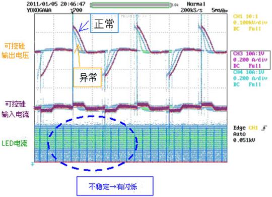 可控硅調(diào)光器在可控硅處于導(dǎo)通狀態(tài)時必須使保持電流持續(xù)流通;一旦保持電流下降,可控硅便關(guān)斷了。由于LED照明燈與原有照明燈相比,功耗極低,所以使可控硅的保持電流下降,調(diào)光器就往往會因此而不定期關(guān)斷從而發(fā)生閃變(閃爍)現(xiàn)象。(圖5)