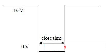 采用可控制開(kāi)關(guān)的辦法難于完成測(cè)量,需采用其他辦法進(jìn)行繼電器觸點(diǎn)通斷過(guò)程的模擬。首先對(duì)繼電器觸點(diǎn)處電壓波形進(jìn)行分析,由于瞬時(shí)通斷測(cè)量?jī)x接入抖閉觸點(diǎn)的電壓為6 V,通過(guò)抖斷觸點(diǎn)的電流為10 mA,當(dāng)繼電器觸點(diǎn)出現(xiàn)抖閉現(xiàn)象時(shí)電壓波形應(yīng)如圖3 所示(抖閉觸點(diǎn)在正常狀態(tài)時(shí)所加的+6 V 電壓在抖閉狀態(tài)時(shí)被直接短路,電位被鉗制在0 V),形成一個(gè)負(fù)跳變脈沖,其抖閉時(shí)間為脈沖寬度,而出現(xiàn)抖斷觸點(diǎn)的電壓波形如圖4 所示。
