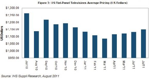 高檔品牌與價值品牌在同樣的市場環(huán)境中激烈競爭。IHS iSuppli公司的研究顯示,7月美國平板電視價格連續(xù)第四個月環(huán)比上漲。平均銷售價格為1150美元,比6月上升1.5%,但比2010年7月下滑9%,如圖所示。尤其是,今年上半年推出的新型號銷售增長,在市場疲弱之際幫助支撐了需求。零售商也報告稱,由于價格較低,32英寸及更小尺寸的電視銷售情況改善。