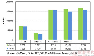 從5大應(yīng)用別的面板出貨來看,均較上月下滑,7月電視面板出貨總量來到1,570萬片,月減6.3%,IT市場表現(xiàn)亦顯疲弱,監(jiān)視器面板7月出貨為1,485萬片,月減7.9%;筆記本面板出貨為1,563萬片,月減0.5%。平板計算機用面板亦較前月衰退1.9%,出貨量709萬片,上網(wǎng)本更是深受平板計算機沖擊,面板出貨量僅313萬片,較上月減少了14.8%。