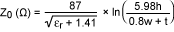 式中,εr為電介質(zhì)的介電常數(shù),h為引線距離地層的高度,w為引線寬度,t為引線厚度(圖7)。w/h介于0.1至2.0、εr介于1至15之間時(shí),該公式的計(jì)算結(jié)果相當(dāng)準(zhǔn)確。