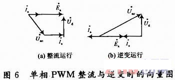 圖6是a相在整流運行、逆變運行時的相量圖。在SPWM調(diào)制方式下,電網(wǎng)電壓ua與ua產(chǎn)生的基波分量uao為正弦波,流過電感La的電流也為正弦波。圖6所示,從a相電路的相量圖可以很容易地看出,三相電壓源型PWM雙向變流器可以實現(xiàn)單位功率因數(shù)運行。