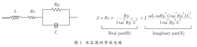 電容器的典型等效電路如圖1 所示, 在該電路中, 電容量C 是電容器的主要成分, Rs 和L 是引線和電極中存在的寄生參數(shù), Rp 代表兩個(gè)電極間的寄生泄漏參數(shù)。