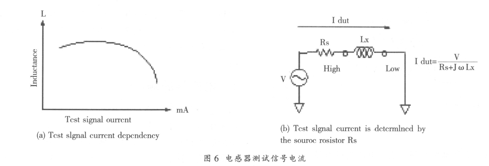 磁性電感器與測試信號(hào)電流的關(guān)系如圖6 (a)所示。電感量隨測量電流的大小而不同, 即使將兩臺(tái)不同的儀器設(shè)置為同樣的輸出電壓, 如果它們的源阻抗不同, 它們的輸出電流也將不同, 請(qǐng)參考圖6 (b)。有些磁性電感器的電感量與流過電流的關(guān)系很大, 電流的變化可導(dǎo)致電感值成倍地變化。我們多次遇到元件制造廠與元件使用廠家的糾紛就源于此。他們用不同的儀器測量同一產(chǎn)品的結(jié)果有很大的不同, 進(jìn)而懷疑儀器有問題, 但儀器經(jīng)過我們計(jì)量校準(zhǔn)是合格的。其實(shí)就是因?yàn)閮x器的源阻抗不同而導(dǎo)致通過測試件的電流不同, 測量結(jié)果當(dāng)然也就不一致。因此一些高檔的LCR 表有電壓、電流監(jiān)視器功能, 可監(jiān)測實(shí)際加在測試件上的電壓及流過測試件的電流。