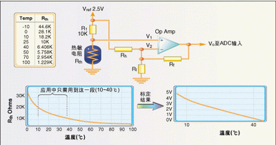 有時(shí)需要對(duì)熱敏電阻的輸入進(jìn)行標(biāo)定以便得到合適的溫度分辨率,圖3是一個(gè)將10~40℃溫度范圍擴(kuò)展到ADC整個(gè)0~5V輸入?yún)^(qū)間的電路。運(yùn)算放大器輸出公式如下: