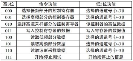 PC 機(jī)發(fā)送的控制字都是8 位的,其中高3 位為控制命令字,用來區(qū)分8 個(gè)命令,低5 位為輔助功能,具體見表3。FPGA 接收到主機(jī)發(fā)來的命令信號后,按命令執(zhí)行相應(yīng)的操作。