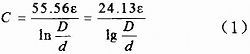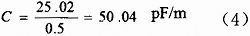 設(shè)樣品浸入水中的長(zhǎng)度為500mm,電容測(cè)試儀顯示值為25.02pF,就可以測(cè)得單位長(zhǎng)度電容為: