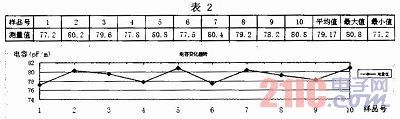 利用同軸電纜芯線電容測(cè)量裝置,測(cè)量型號(hào)為50-5芯線,各時(shí)段樣品的測(cè)量結(jié)果及變化曲線見表2。只要在數(shù)據(jù)表(電子版)中輸入數(shù)據(jù),就會(huì)自動(dòng)繪制曲線。該圖表可以監(jiān)視芯線電容的變化情況。