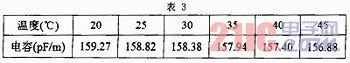 不同絕緣材料的電纜芯線,其電容隨溫度變化而改變。例如如表3所示。