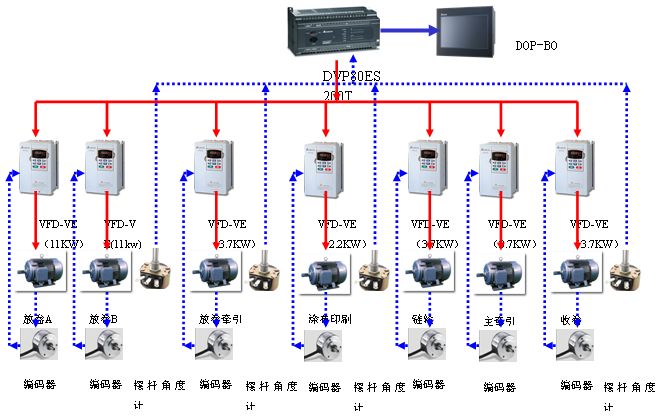 系統(tǒng)中所有變頻傳動(dòng)軸均采用了編碼器反饋的閉環(huán)的矢量控制模式,之所以使用閉環(huán)矢量控制模式,是為了保證傳動(dòng)軸的速度控制精度能夠更準(zhǔn)確、更快速、更穩(wěn)定,盡量避免電機(jī)的滑差所造成的不同速度的線速度線形關(guān)系。