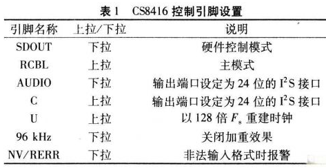 CS8416是數(shù)字音頻信號接收電路的核心。在軟件控制方式下,MCU通過SPI或I2C接口沒置參數(shù)。該方式還可靈活更改內(nèi)部配置。在無MCU時則通過硬件控制方式改變其特定引腳電平實現(xiàn)控制。由于本系統(tǒng)中無MCU,因此采用硬件控制方式。在SDOUT引腳上用一只47kΩ電阻下拉至地即可,且引腳AUDIO、RCBL、U、C等不能懸空,必須通過一只47kΩ電阻上拉至高電平或下拉至低電平,以便系統(tǒng)復位后,CS8416通過檢測這些引腳電平?jīng)Q定其工作狀態(tài)。表1為該系統(tǒng)設計的控制引腳的配置。
