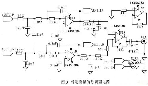 WM8741輸出的模擬信號中夾雜高次諧波分量,因此需經(jīng)低通濾波濾除高頻噪聲,進而得到較為純凈的模擬信號。濾波電路采用LM4562型運算放大器。對于數(shù)模轉換電路,在D/A轉換器的后面需采用3階濾波器才能達到防混疊要求。由LM4562外加電阻電容組成的三階巴特沃斯低通濾波器,如圖3所示。濾波器是單位增益,通頻帶內(nèi)平坦度好。經(jīng)濾波后的信號可直接作為解碼器的平衡信號輸出。當以RCA接口輸出時,還需把差分信號轉換為單端信號,該轉換電路是由一片LM4562組成的差動放大電路。單端信號經(jīng)一只10μF的隔直電容輸出到RCA接口。LM4562采用單獨的±12V電源供電。