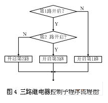 下面是系統(tǒng)中幾個(gè)子程序的流程圖:三路繼電器控制子程序流程圖如圖4?! ?/p>