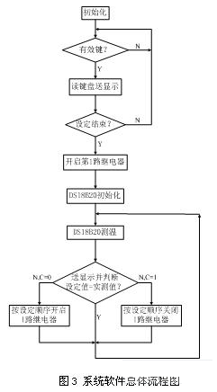 系統(tǒng)軟件總體流程圖如圖3所示。系統(tǒng)上電后,首先進(jìn)行初始化,對(duì)寄存器和I/O端口進(jìn)行設(shè)置。當(dāng)檢測(cè)到按鍵有效信號(hào),讀取按鍵數(shù)據(jù),傳遞給單片機(jī)并送顯示模塊顯示,鍵盤(pán)設(shè)定結(jié)束后置標(biāo)志位,單片機(jī)檢測(cè)到此信號(hào)后,開(kāi)啟第1路繼電器進(jìn)行加熱。此時(shí)初始化數(shù)字溫度計(jì)DS18B20進(jìn)行溫度測(cè)量,并將測(cè)得實(shí)時(shí)溫度數(shù)據(jù)送單片機(jī)處理,再由顯示模塊顯示。DS18B20每測(cè)完一次溫度后,就將實(shí)測(cè)溫度值與設(shè)定溫度值的上限和下限進(jìn)行比較,如實(shí)測(cè)溫度高于設(shè)定溫度的上限,轉(zhuǎn)到繼電器關(guān)閉處理程序,檢測(cè)每一路繼電器的開(kāi)、關(guān)狀態(tài),按照第3路、第2路、第1路的順序關(guān)閉繼電器(每執(zhí)行1次關(guān)閉1路繼電器);如實(shí)測(cè)溫度低于設(shè)定溫度的下限,轉(zhuǎn)到繼電器開(kāi)啟處理程序,檢測(cè)每一路繼電器的開(kāi)、關(guān)狀態(tài),按照第1路、第2路、第3路的順序開(kāi)啟繼電器(每執(zhí)行1次開(kāi)啟1路繼電器)。在之后的系統(tǒng)工作中始終循環(huán)測(cè)溫~溫度值比較~開(kāi)啟或者關(guān)閉繼電器這樣的流程,以達(dá)到對(duì)加熱區(qū)域溫度恒溫控制的目的。