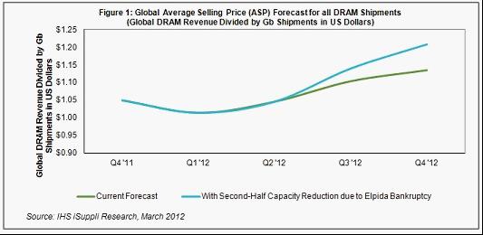 如果爾必達(dá)的產(chǎn)能減少逾25%,則到2012年底,所有DRAM出貨量的全球平均銷售價格(ASP)預(yù)計上升到1.21美元,比上半年末的1.05美元上漲15.5%,如圖1所示。如果不是破產(chǎn)導(dǎo)致產(chǎn)能大減,今年底價格將上升到1.13美元,只比上半年末的水平高出8.5%。