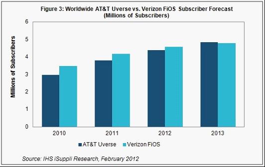 據(jù)IHS Screen Digest的研究報告,2011年第四季度美國電話電報公司(AT&T)的Uverse服務(wù)新增用戶數(shù)量,多于對手Verizon的FiOS服務(wù)。這是AT&T在競爭激烈的付費電視領(lǐng)域連續(xù)第10個季度戰(zhàn)勝Verizon。