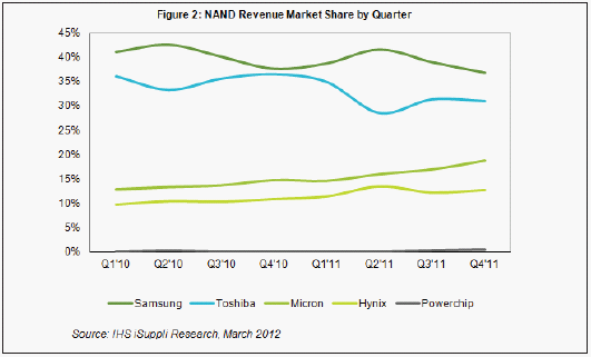 在材料方面,晶圓供應(yīng)商在一個(gè)月后就快速恢復(fù)了生產(chǎn),并提高了其它地點(diǎn)的產(chǎn)量,使其主要客戶面臨的供應(yīng)短缺問(wèn)題降低最小。中期來(lái)看,這場(chǎng)災(zāi)害實(shí)際上導(dǎo)致NAND市場(chǎng)更加接近供需平衡,幫助該產(chǎn)業(yè)的營(yíng)業(yè)收入在2011年第三季度環(huán)比增長(zhǎng)10.0%,而2010年第三季度是環(huán)比增長(zhǎng)9.1%。