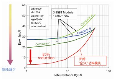內(nèi)置了最先進(jìn)的SiC-SBD與SiC-MOSFET的“全SiC”模塊,與傳統(tǒng)的Si-IGBT相比,開關(guān)損耗可降低85%。